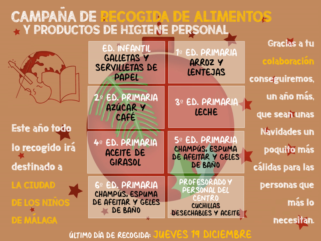 Como siempre también es tiempo de ayudar a las familias más necesitadas. Es por eso que desde el Plan de Escuela Espacio de Paz organizamos la recogida de alimentos y productos de aseo personal. Este año todo lo recogido irá destinado a La Ciudad de los Niños ¡Gracias como siempre por vuestra participación!.