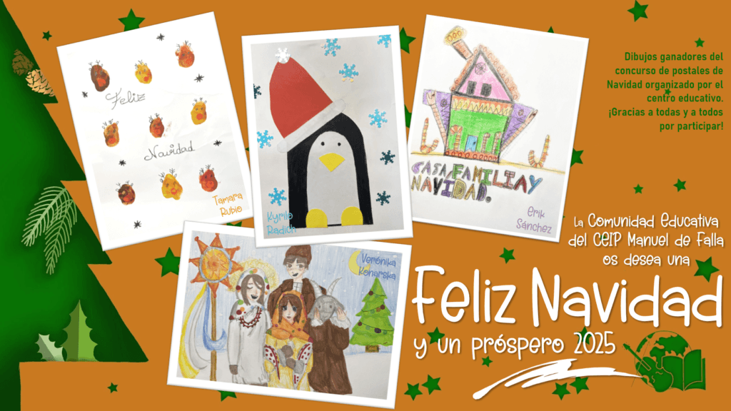 El personal docente y no docente del CEIP Manuel de Falla os desea una FELIZ NAVIDAD Y PRÓSPERO 2025.