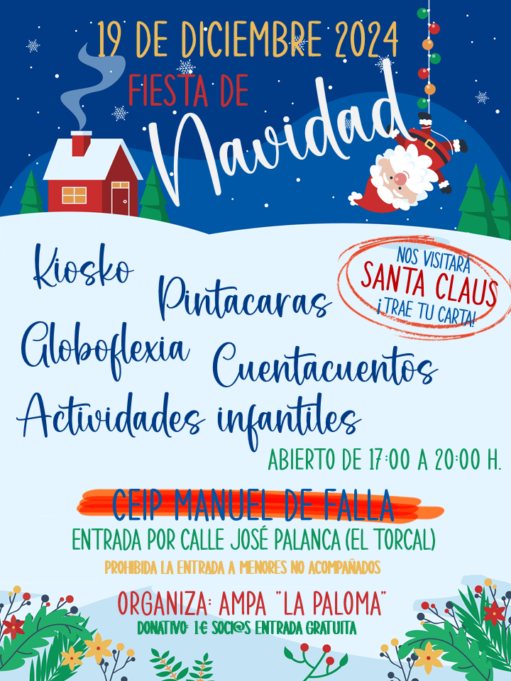 Además, nuestra Asociación de Madres y Padres «La Paloma» organiza este año una actividad destinada al alumnado y familias por la tarde para endulzaros un poco estas fiestas y podáis pasar un rato de convivencia en el centro. ¡os esperamos!
