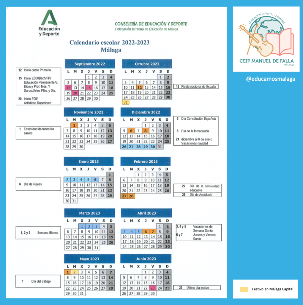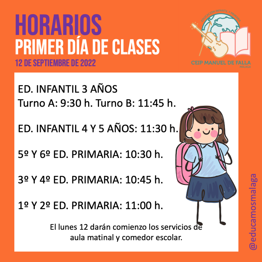 Nosotros y nosotras ya estamos trabajando para ofrecer lo mejor de nosotros y nosotras. En esta ocasión os informamos del CALENDARIO ESCOLAR 2022/23 y del HORARIO DEL PRIMER DÍA DE CLASES que comenzarán el próximo lunes 12 de septiembre con un horario flexible de entrada al centro.