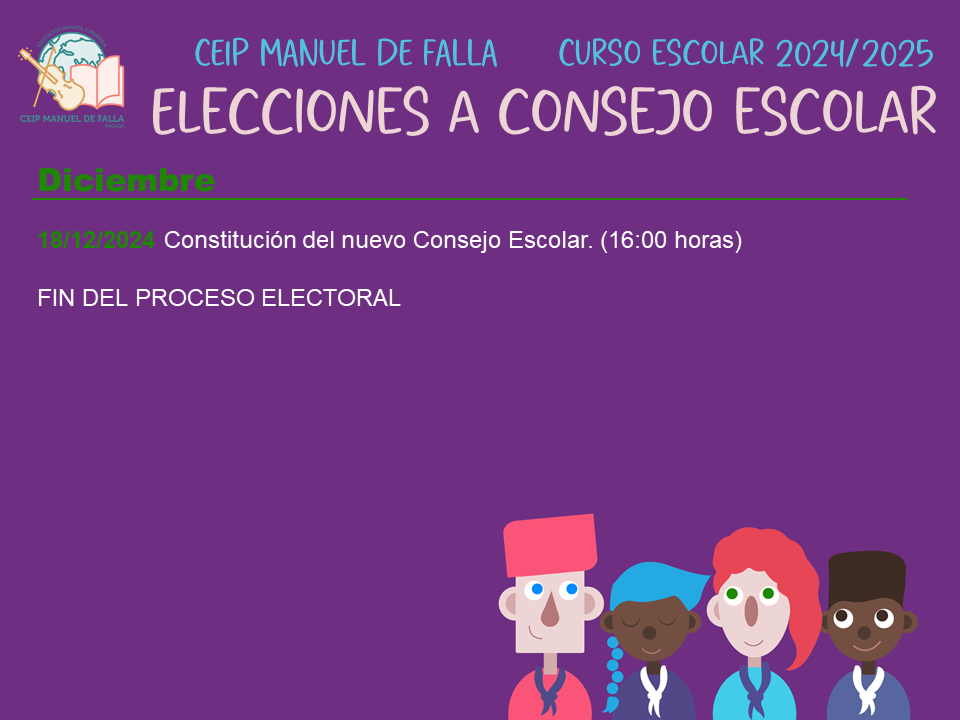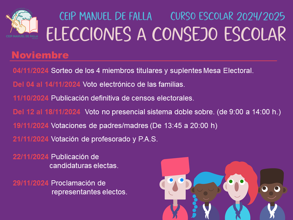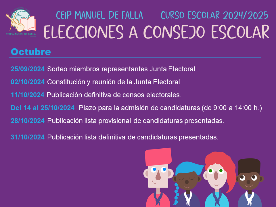 aquí os dejamos el calendario que regulará el desarrollo del proceso electoral para la renovación y constitución del nuevo Consejo Escolar y que transcurrirá durante los meses de octubre, noviembre y diciembre de 2024.