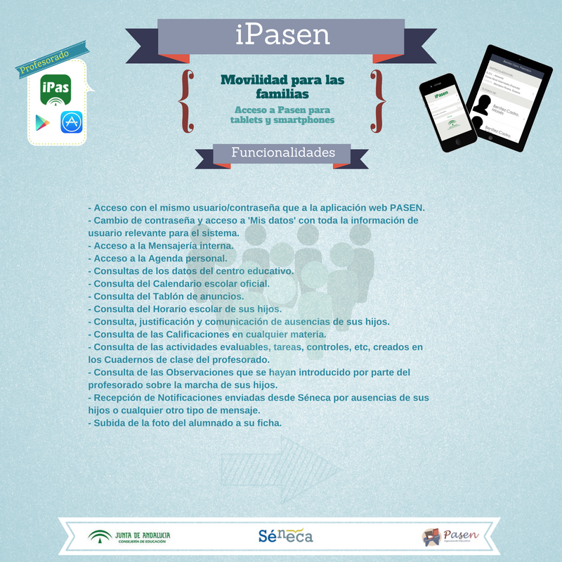iPasen es la aplicación para teléfonos móviles y tabletas diseñada por la Consejería de Educación que permite la comunicación entre los distintos miembros de la comunidad educativa (tutores/as legales, alumnado, cargos directivos y profesorado).