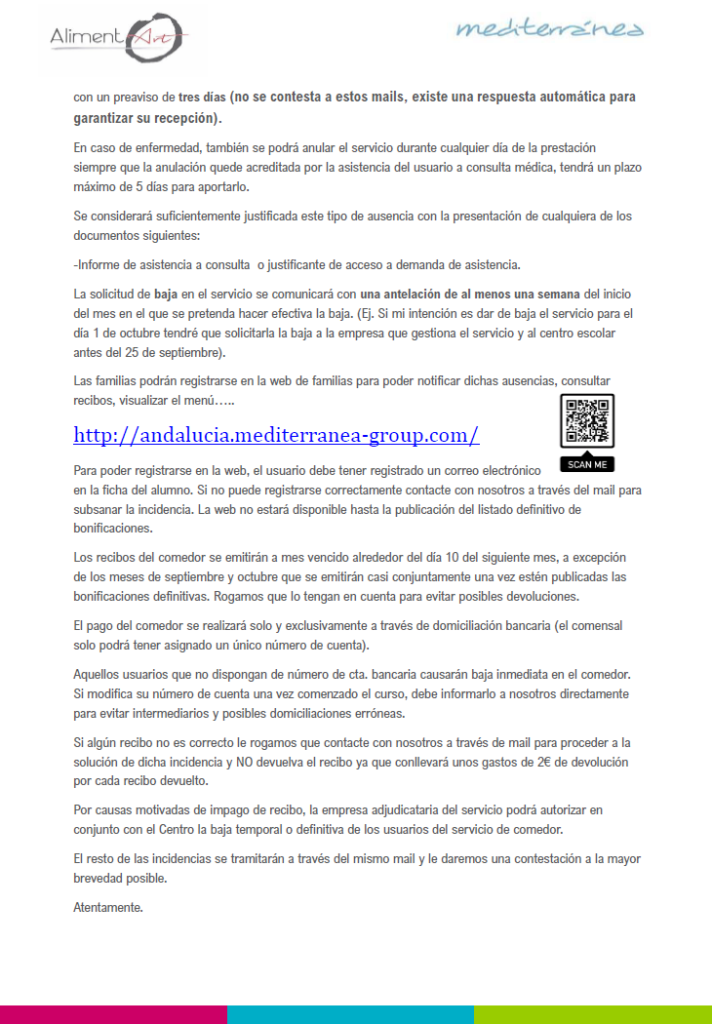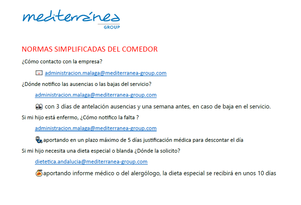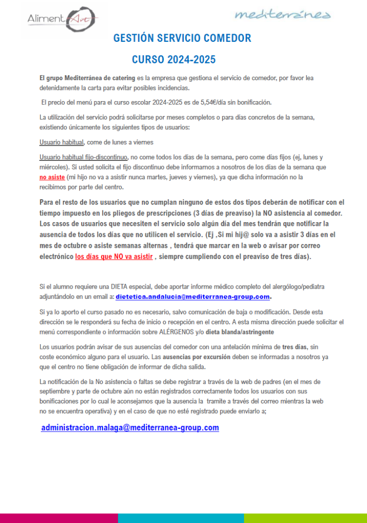 IMPORTANTE: Si el alumno requiere una dieta especial debe aportar informe del alergólogo/pediatra y la dieta la recibirán en el centro a los 10 días de la recepción del informe médico al mail: